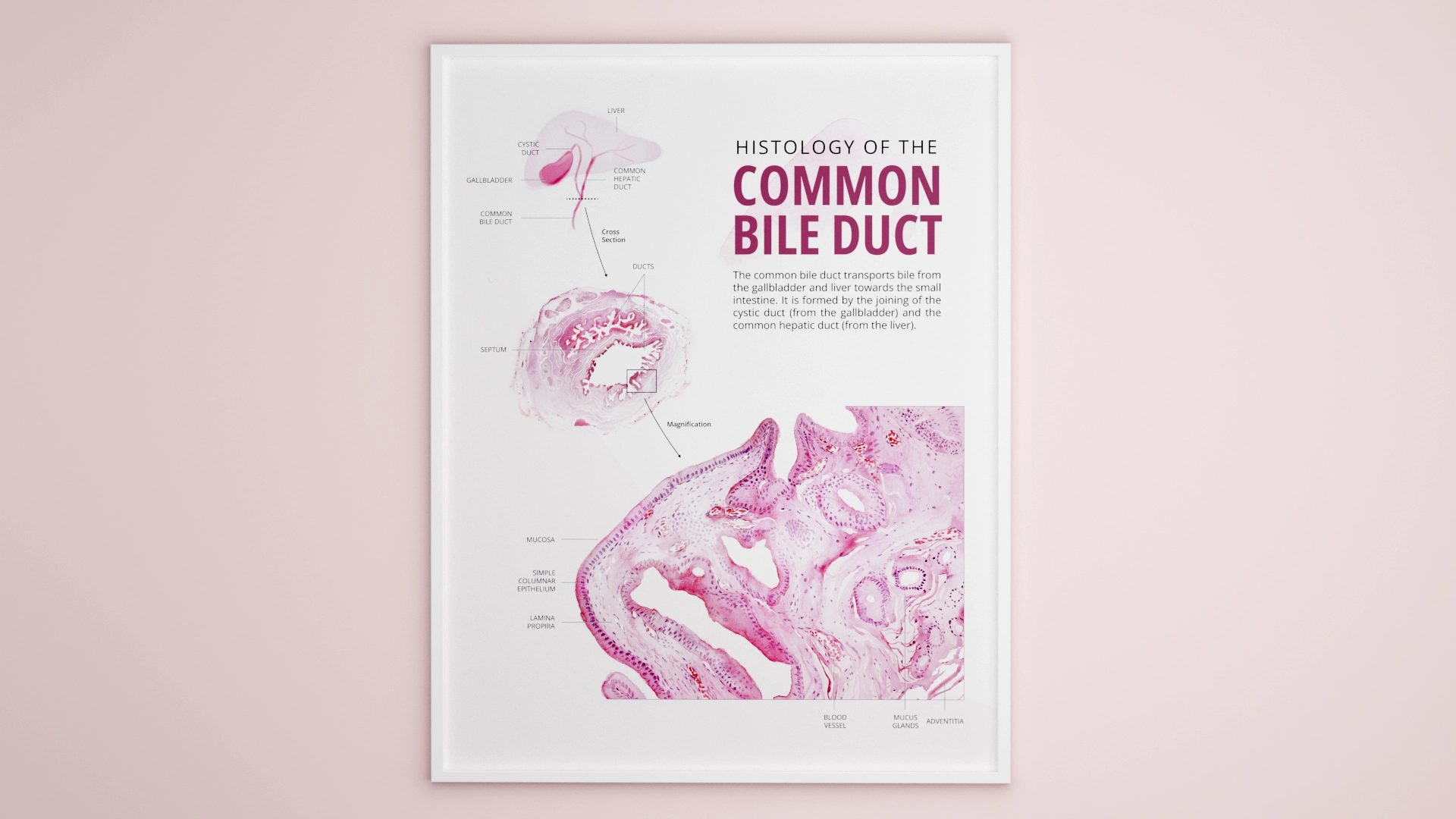 This poster features watercolour illustrations and showcases the location and complex histology of the common bile duct.