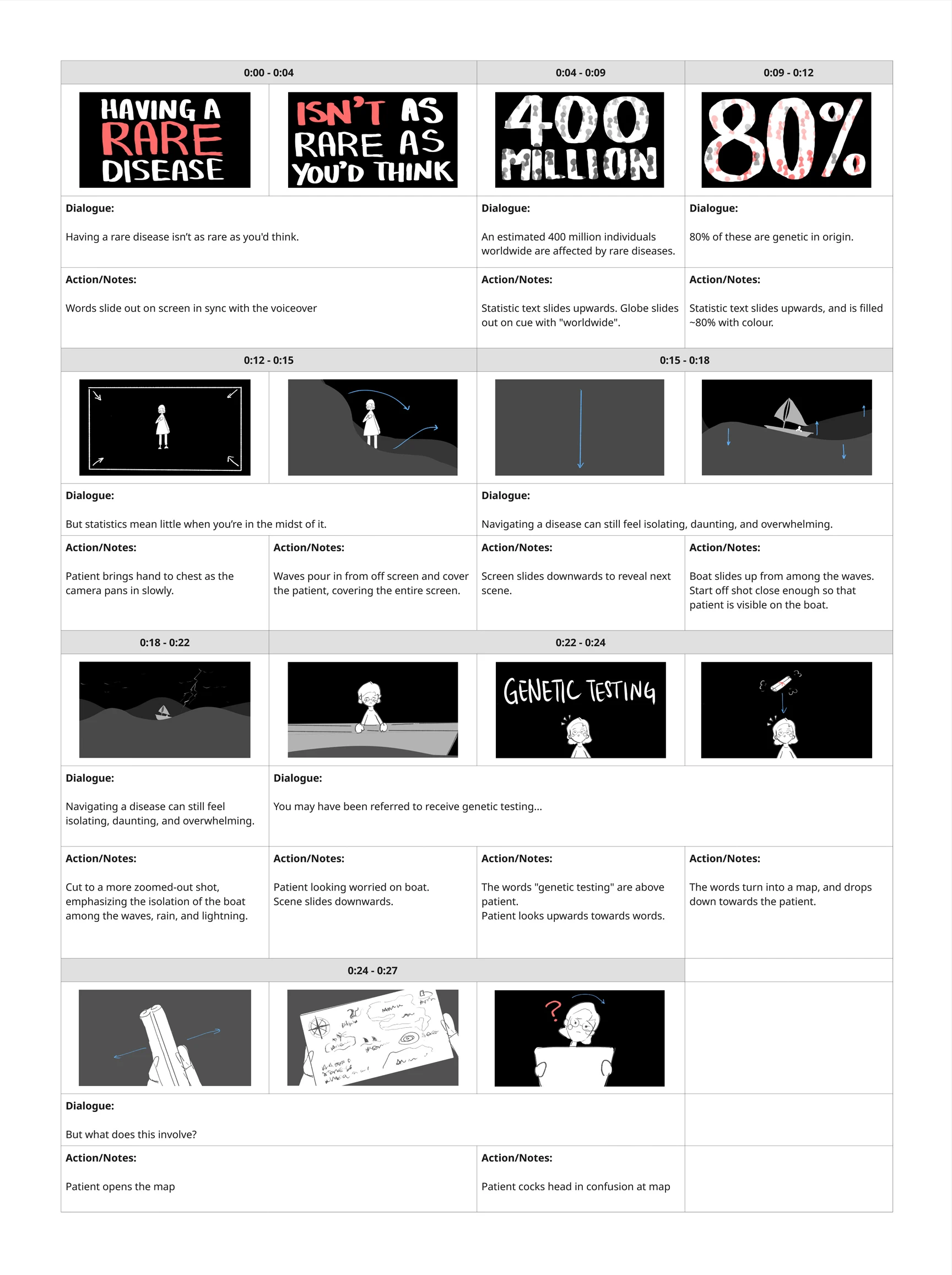 We decided to create an animation aimed at a patients receiving genetic test that guides them through the process using empathetic storytelling and visual metaphors. To tie the story together, we took inspiration from the term “diagnostic odyssey” – a term referring to the long and often difficult journey many patients with genetic diseases undergo before they receive a diagnosis – and structured the video around a central metaphor of a journey through a storm.
